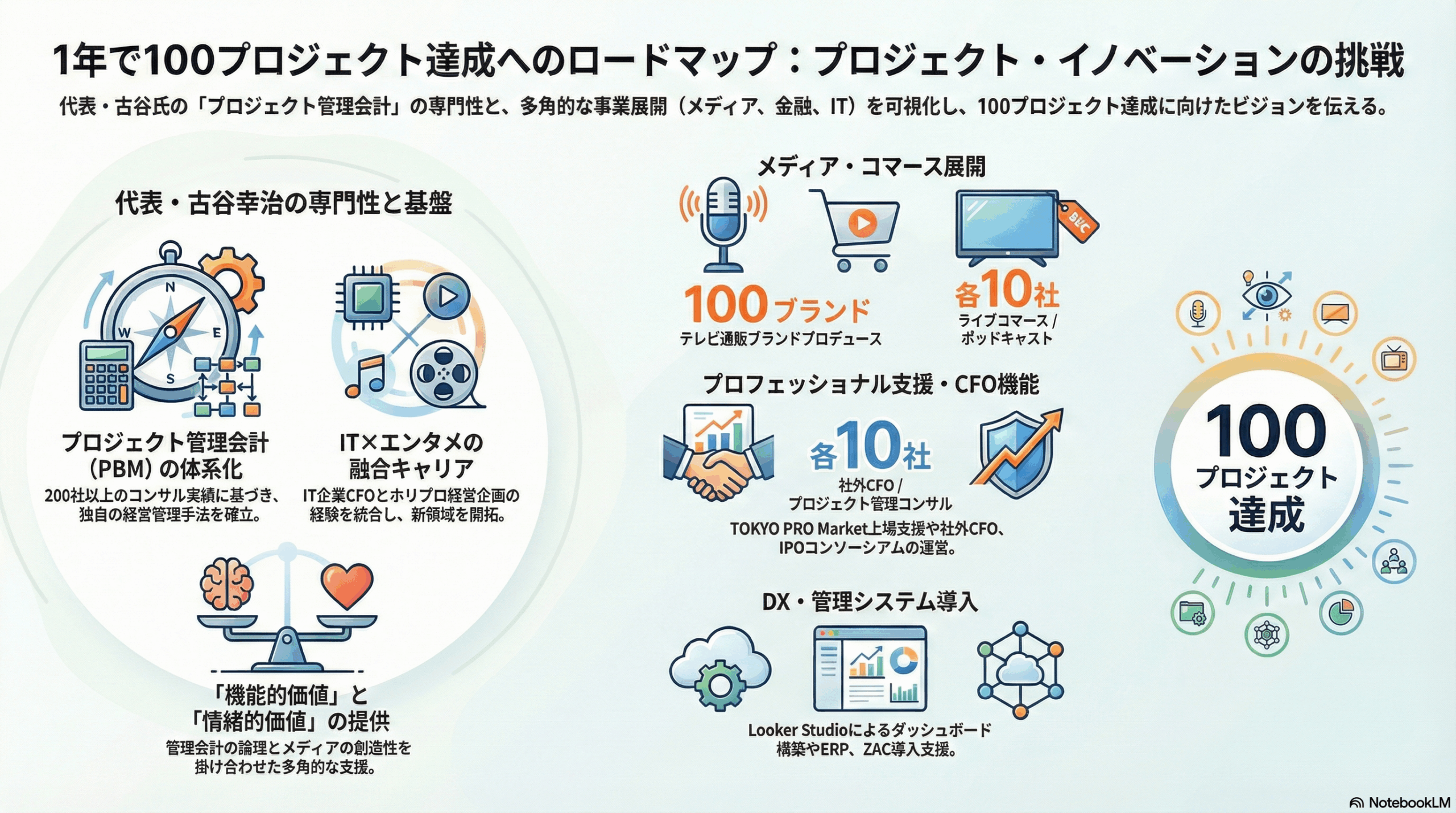 最終的には「1年で100プロジェクト」の達成を目指し、経営管理とマーケティングの両輪で企業成長を支援する構想が描かれています。このように、専門的な財務マネジメントとエンターテインメントを融合させた独自のビジネスモデルが示されています。