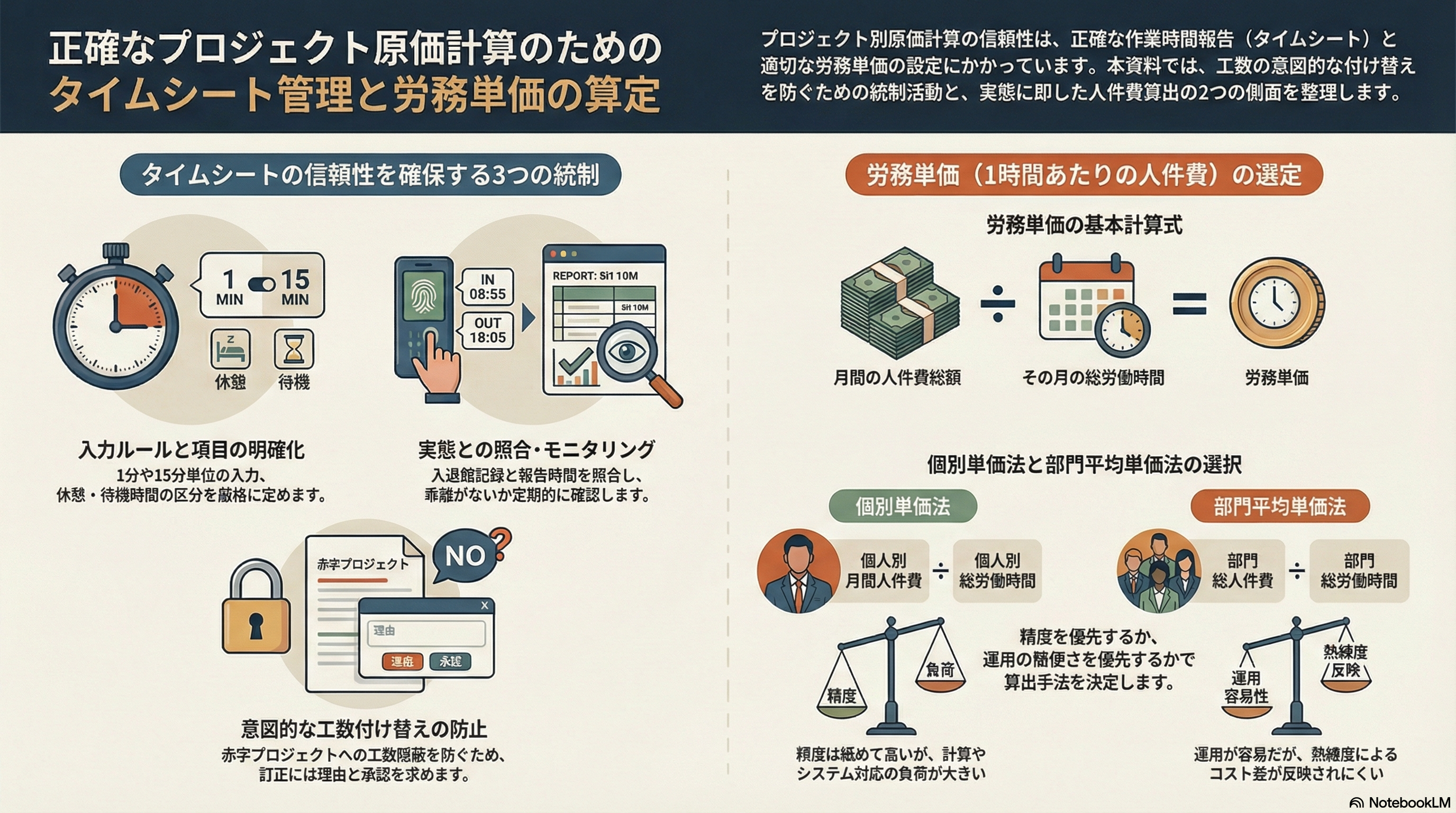 このポッドキャストは、プロジェクトごとの原価計算を正確に行うためのタイムシート管理と労務費の算出方法について解説しています。まず、不正な工数振替を防ぎ財務諸表の信頼性を保つために、入力ルールの明確化や承認フローの構築といった内部統制の重要性を強調しています。具体的には、労働時間と勤怠記録の照合や、修正時の理由明記などを通じてデータの正確性を担保する手順が示されています。また、人件費の計算においては、個人別の単価を用いる手法と部門平均単価を用いる二通りの計算アプローチが紹介されています。最終的には、企業の規模や管理システムに合わせた適切な原価管理手法の選択を促す内容となっています。