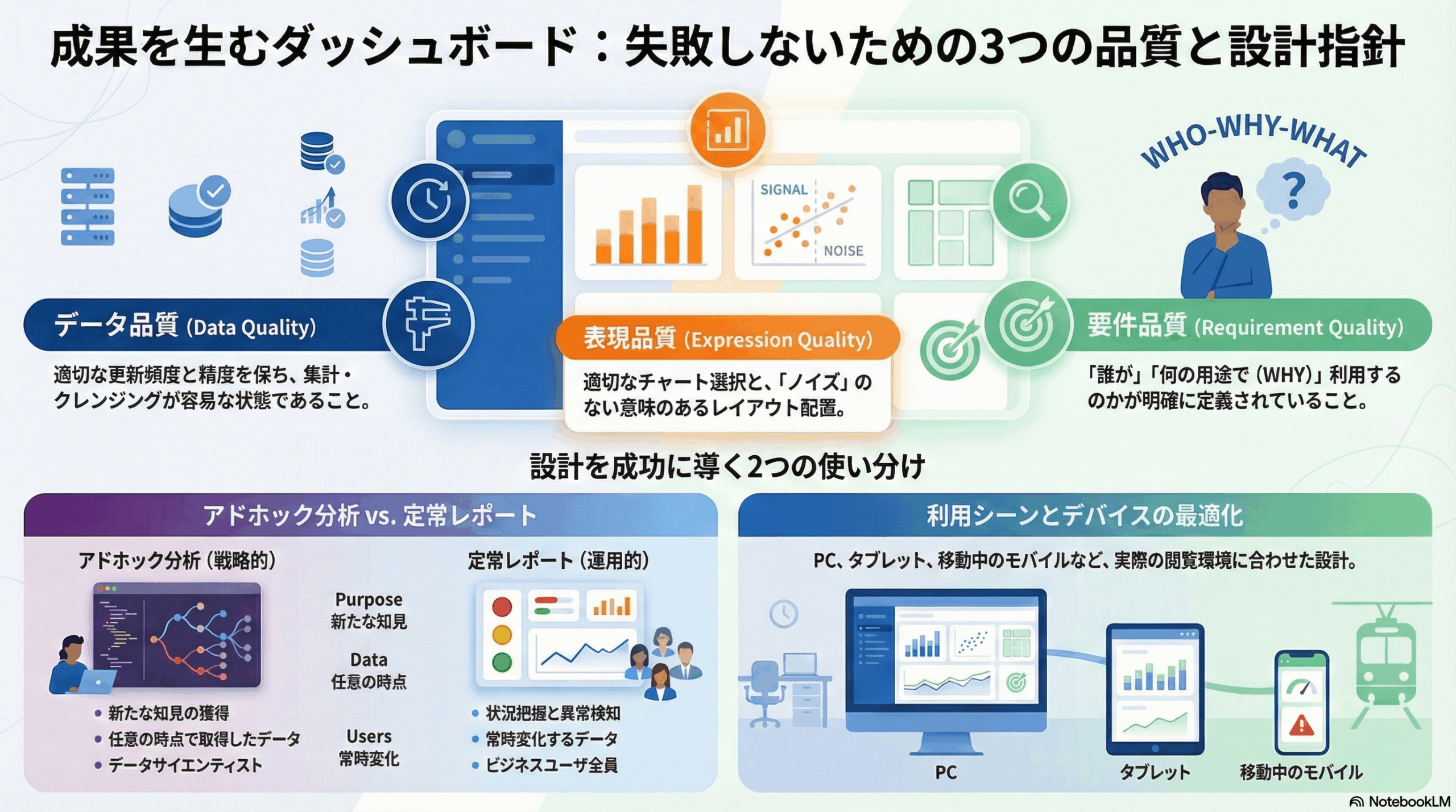 これらのポッドキャストは、効果的な経営ダッシュボードを構築するための重要な3要素である「データ品質」「表現品質」「要件定義」について詳しく解説しています。特に、誰がどのような目的で利用するのかを明確に定義することの重要性を強調しており、目的が曖昧な設計は利用者に価値を届けられないと警告しています。また、一度限りの分析を行うアドホック分析と、日常的に状況を監視する定常レポートの役割の違いについても詳しく分類されています。さらに、利用者の視点に立ったグラフの選択やレイアウトの配置、そして直感的な操作を可能にするインタラクション機能の活用についても言及しています。最終的に、作成者の自己満足に陥ることなく、利用者の意思決定を支援するための具体的な設計指針を提示した内容となっています。
